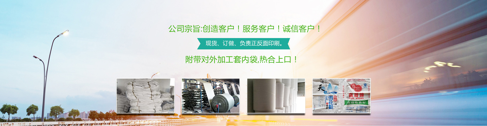 本公司常年生產: 編織袋、彩膜、食品袋、集裝袋、飼料袋、化肥袋、水泥袋、化工袋、普危包裝袋、坯布專用內袋、包皮、印染廠整裝專用包裝、有現貨、也訂做、負責正反面印刷。附帶對外加工套內袋,熱合上口!聯系人:王經理。 公司宗旨:創造客戶!服務客戶!誠信客戶! 13256289338.17686389888
